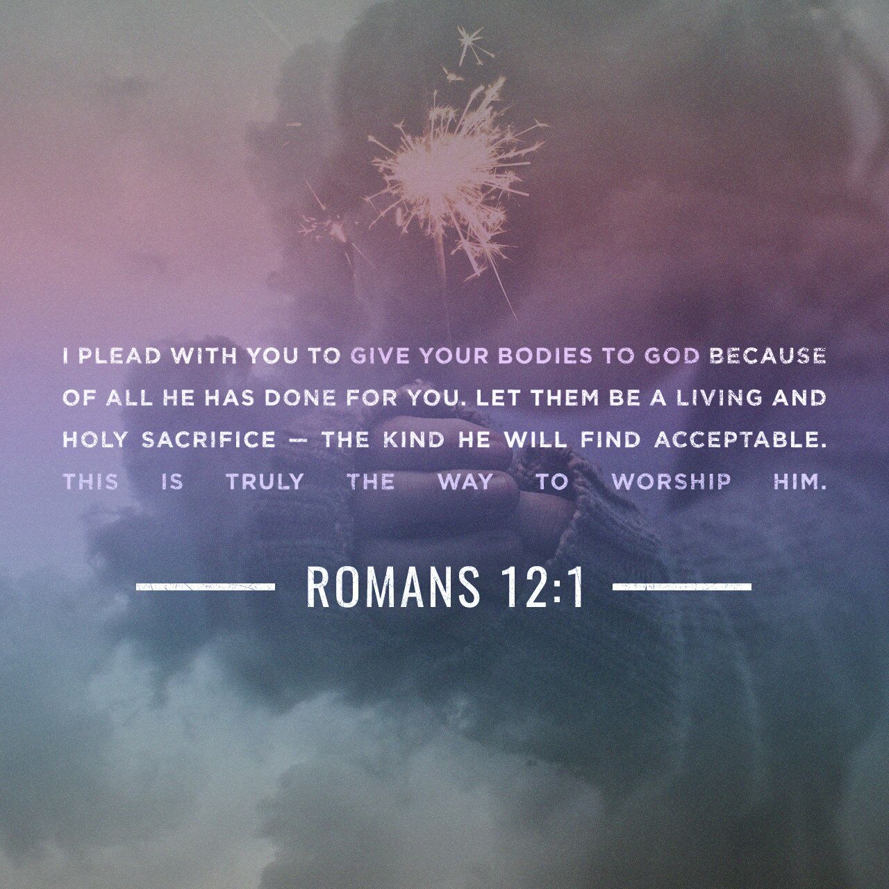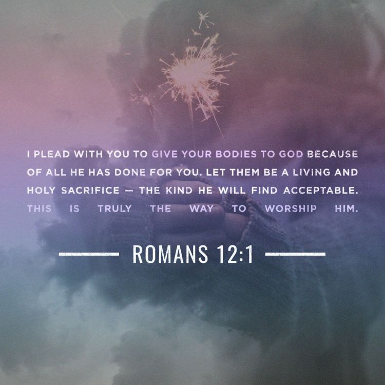 And so, dear brothers and sisters, I plead with you to give your bodies to God because of all he has done for you. Let them be a living and holy sacrifice—the kind he will find acceptable. This is truly the way to worship him.
