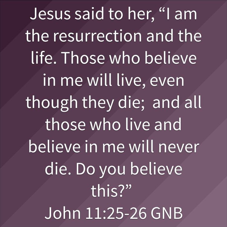 Jesus said to her, “I am the resurrection and the life. Those who believe in me will live, even though they die; and all those who live and believe in me will never die. Do you believe this?”
