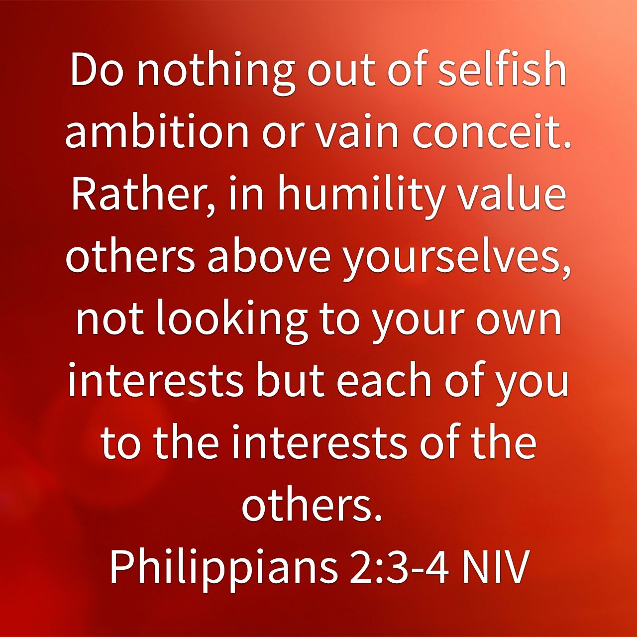 Do nothing out of selfish ambition or vain conceit. Rather, in humility value others above yourselves, not looking to your own interests but each of you to the interests of the others.