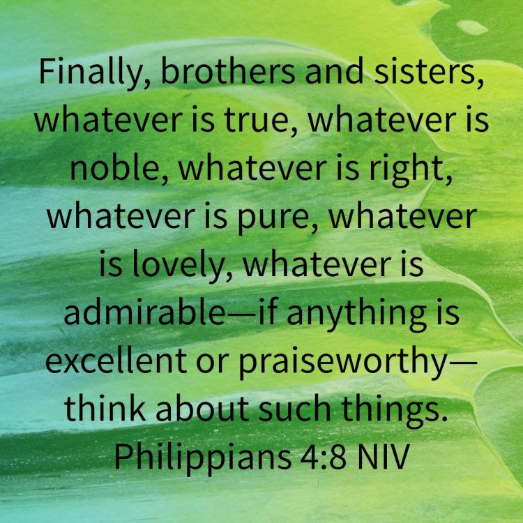 I wonder how much thought we put into what we think about. If we reflect on how we think and what we dwell on many of us would probably hope that no one found out. It seems natural and even attractive to think negative, discouraging, demeaning and impure thoughts about ourselves and others. These thoughts affect our attitudes and our actions. Is it surprising then that as followers of Jesus we are instructed to think differently? It is hard work to train our mind to appreciate pure, positive and praiseworthy things. When we do we realise that it feels right because it resonates with the Spirit living within us. What do you think about and dwell on?